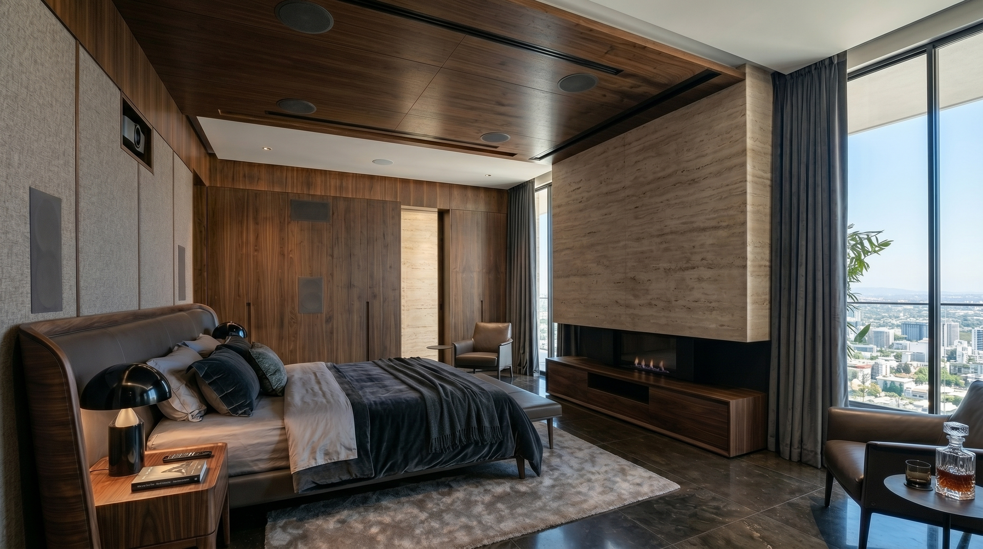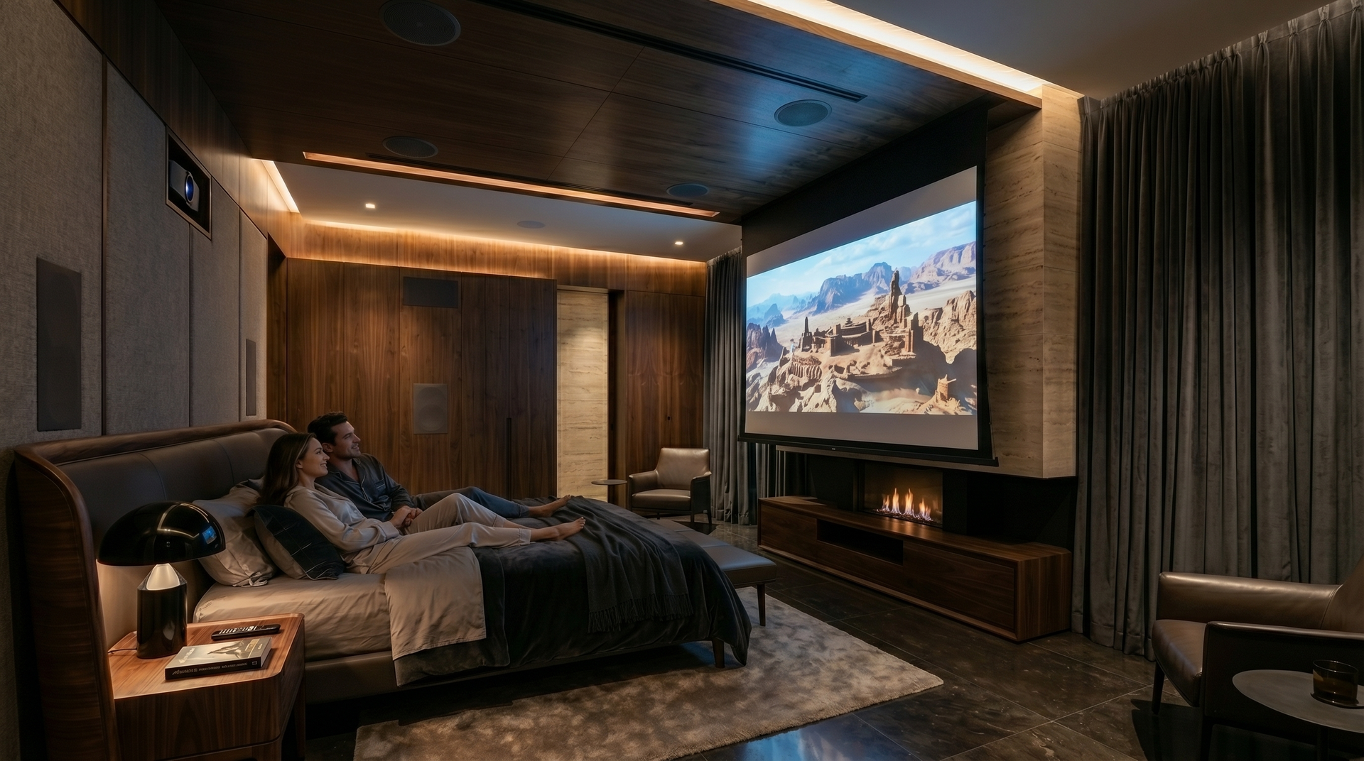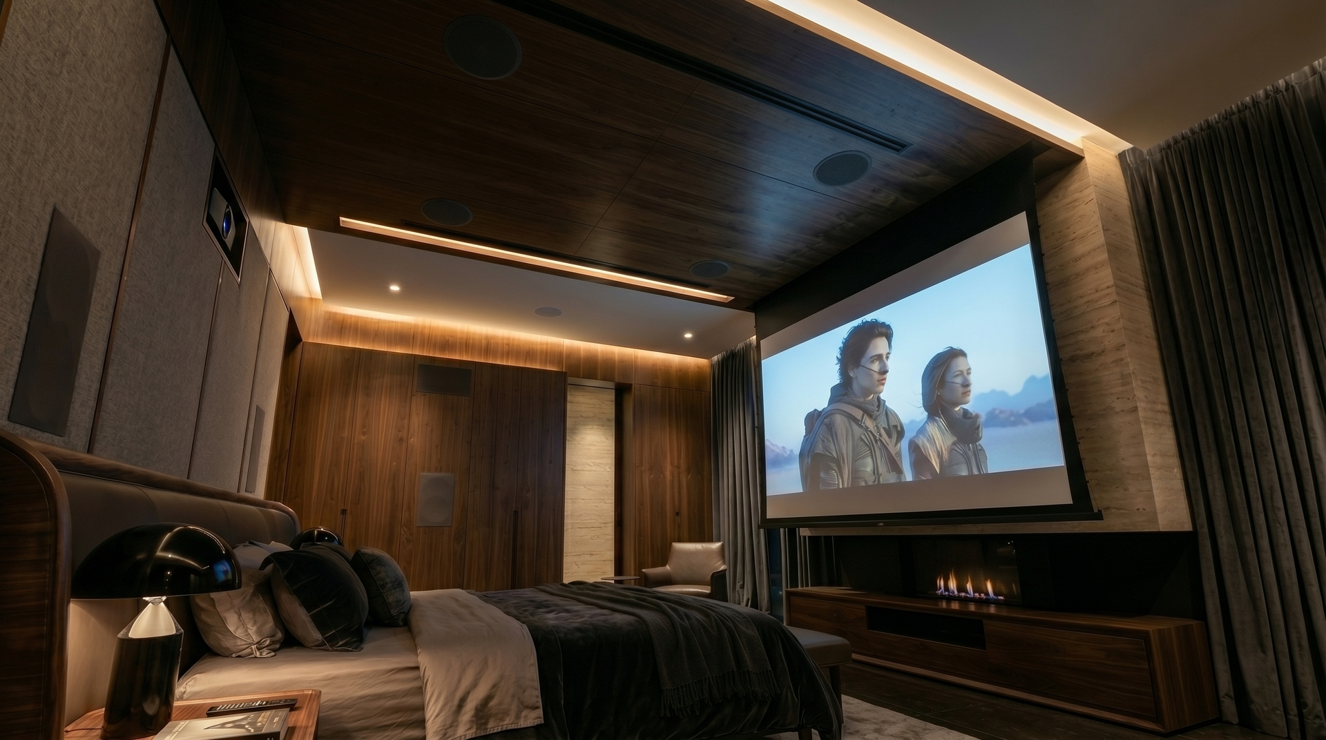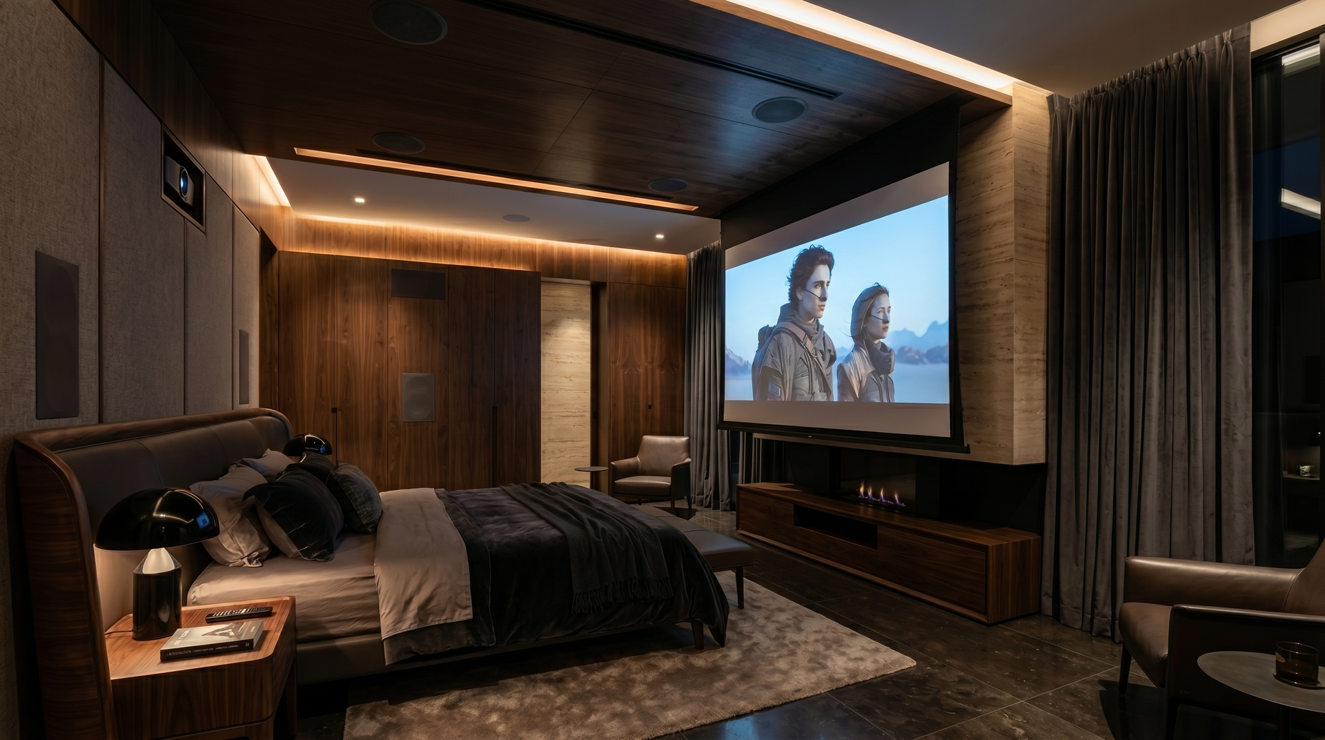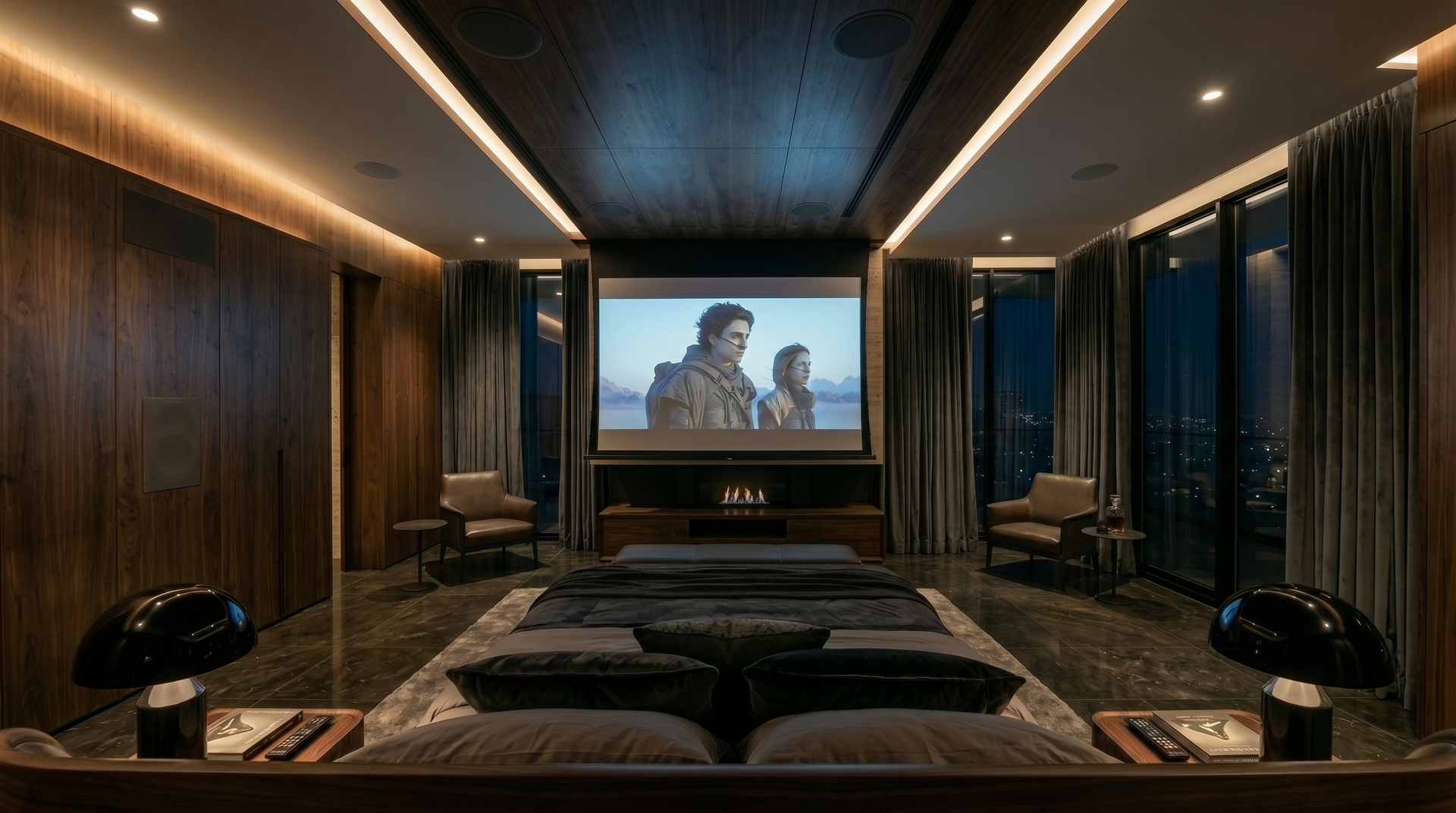 Un progetto pensato per integrare un vero home cinema all’interno di una suite padronale di alto livello, mantenendo l’eleganza della zona notte e nascondendo la tecnologia all’interno dell’architettura.